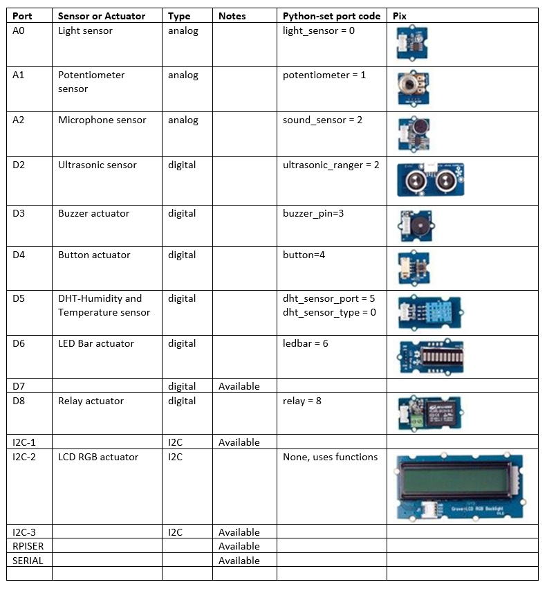 Raspberry Pi Model 3 B+, GrovePi+ board with the same 10 sensors and actuators wired up to the same ports as indicated below.